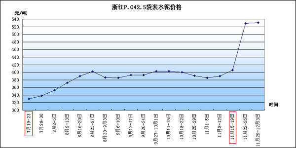 整個(gè)華東地區(qū),浙江最先開(kāi)始漲價(jià),7月底開(kāi)始,隨后的一個(gè)月連續(xù)5次漲價(jià),P.O42.5水泥平均價(jià)格從330元左右一噸,直沖400元/噸。從此,浙江水泥價(jià)格走出價(jià)格洼地。盡管在之后的兩個(gè)左右時(shí)間里,價(jià)格出現(xiàn)小幅震蕩,但價(jià)格始終維持在380元/以上。11月中旬,價(jià)格再次大幅上調(diào),沖到歷史高位,每噸水泥價(jià)格達(dá)到500元以上......[詳情] |