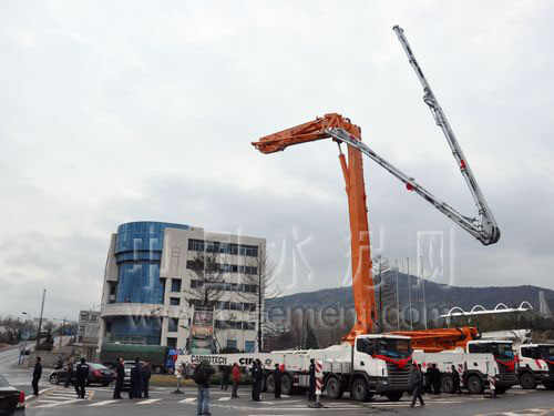 開至現(xiàn)場的碳纖維62米長臂架泵車引起眾人圍觀